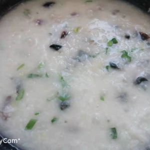 将皮蛋葱姜,倒入熬过45分钟的粥中,熬大概10分钟,切勿时间太长,肉会老。