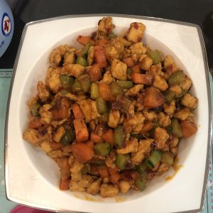 将鸡肉炒熟后备用,在将胡萝卜和黄瓜丁放入锅内翻炒,将鸡肉丁放入翻炒,放豆瓣酱,酱油,醋,翻炒至熟。