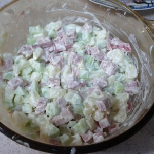 土豆水里煮熟,筷子插下去能穿过就行了。然后去皮切丁。