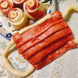 面粉里加入牛奶,白糖,酵母搅拌成棉絮状揉成面团,面团一分为二,一半加入红曲粉揉成红色面团,然后放温暖出发酵。