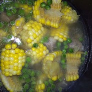 将排骨,玉米,适量的盐生姜,大蒜,八角,花椒放入锅中,加水没过材料,大火煮开,转小火炖至20分钟,再加入青豆,生抽,料酒炖至青豆煮透即可
