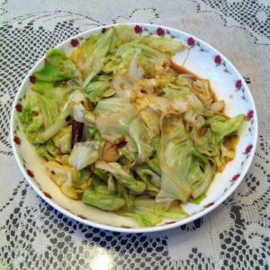 放圆白菜,大火爆炒。放生抽、盐、醋
