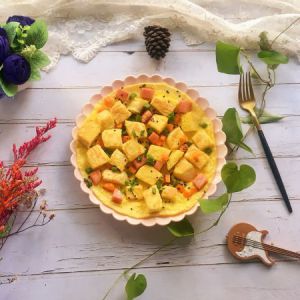 趁蛋液美凝固的时候将烤得酥脆的馒头放上去再放入火腿胡萝卜丁。