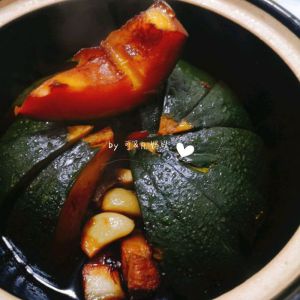 选一只和自己石锅大小差不多的南瓜,我选用了贝贝南瓜,这里也可以选市面上卖的红色南瓜。对半切开,去除瓜囊清洗干净备用。