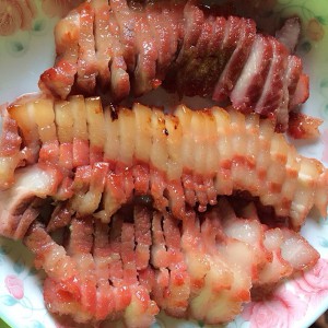 把洗好沥干水分的猪肉放大碗里加入2勺叉烧酱,我用的是李锦记的,再把5片生姜放进去,用手抓均匀,放冰箱腌制一晚上