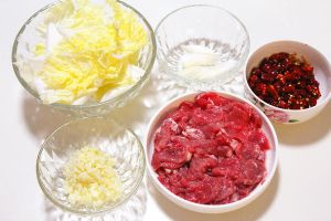 尽量将牛肉上的筋膜都去掉,然后切成3厘米大小、2毫米厚的肉片。白菜帮斜刀切片,白菜叶用手撕成大块。干辣椒剪成段,葱切段,蒜切末备用。