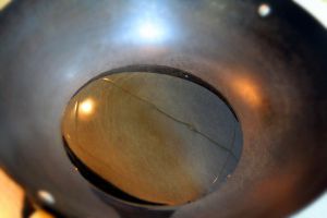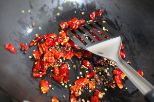 锅里倒入一小勺食用油,然后将干辣椒和花椒放入锅中小火煸炒。煸炒至花椒成熟,干辣椒红亮即可关火。