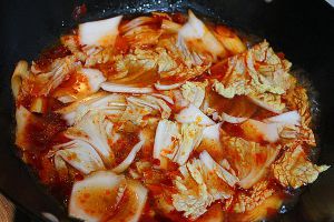 将白菜放入锅中煮两分钟直到断生,然后捞到大碗里。