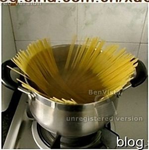 烧开一锅水,并在水中加入1茶匙盐,将意大利面放入锅中。