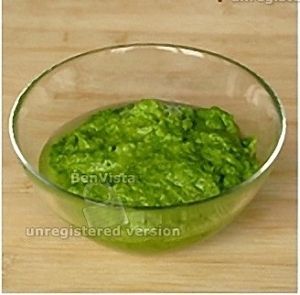 即成香菜杏仁蒜泥青酱。最后挤上柠檬汁可以防止青酱氧化变色。
