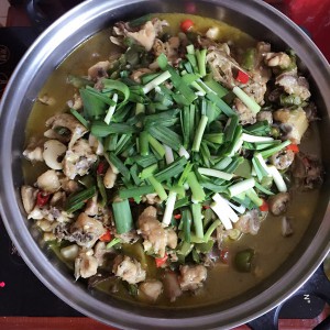 把鸡盛出来、用炒鸡的油接着(7成热)放入花椒、青椒、尖椒、小米椒一起翻炒,然后把鸡倒入锅中和辣椒一起炒(小火,否则会糊锅)
