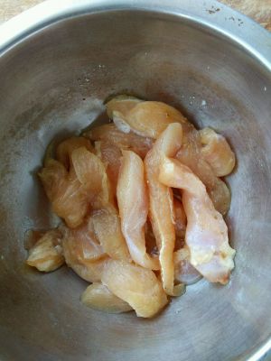 鸡胸脯肉,用刀背拍松,然后切成条状。用盐,糖,孜然粉,料酒腌半个小时。