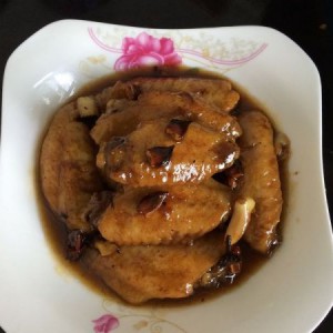 八角放入油锅中爆香,放入鸡翅两面煎炸至金黄色,