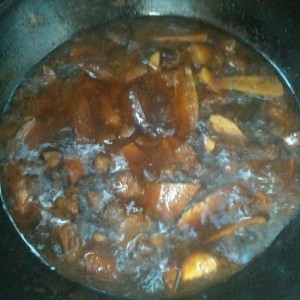 把汤倒入锅里没过肉,加冰糖大火烧开后放干子 沸腾了再改成小火收汁 千万小心注意锅里哦,不然很容易糊锅