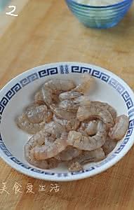 活的明虾入冰箱冷冻20分钟后,去处,去头剥壳去肠泥(活虾剥壳之前入冰箱冷冻20分钟后再剥,会更好操作),成虾仁。用一点点盐、白胡椒粉和料酒抓匀腌制。