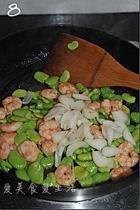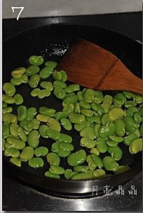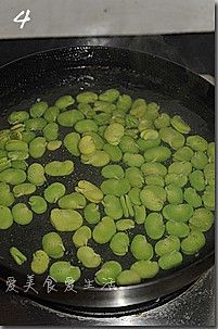 用锅中余油煸炒焯过水的蚕豆米,大约一分钟。