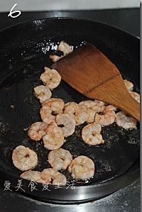 锅烧热放油,油温热的时候,倒入腌制好的虾仁,滑炒至变色,盛出备用。