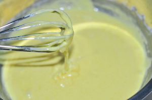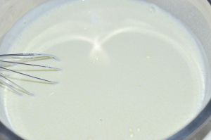 4)将加热好的牛奶分多次加入面粉糊中,搅拌均匀。(不要一次全部加入,这样会将蛋黄烫熟凝固)