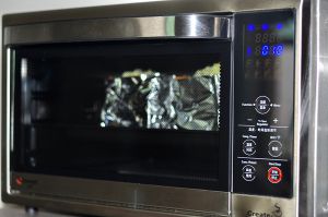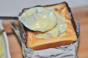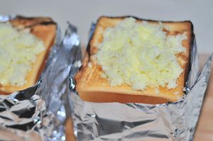 烤好的土司用锡纸包住四周,将做好的馅,放入土司中。