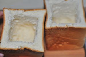 土司切成2等份,四周各留1cm的边,将中间部分挖掉。放入烤盘。