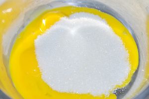 2)蛋黄和白砂糖混合,搅拌打发至蛋黄颜色变白色。