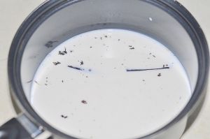 1)牛奶中刮入香草荚籽。用小火煮至快要沸腾的时候,关火。
