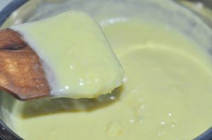5)将搅拌好的面糊,小火煮至粘稠,需要不停的搅拌,防止粘锅。(铲子提起来可以流动),关火,捞掉香草荚。