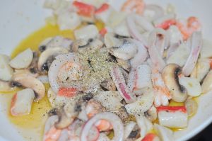 放入虾仁、鱿鱼圈、口蘑片炒匀。