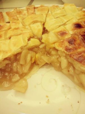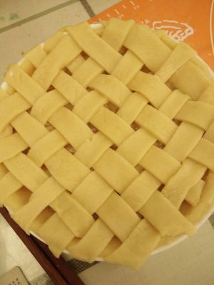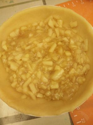 面皮平铺至6寸派盘,没有派盘的就用小菜盘子。用叉子轻轻扎出无数个小孔。倒入苹果馅,我的馅料少了点。多余的面皮留用。