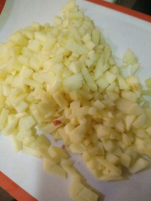 等面团醒发时,可以制作苹果馅了。苹果去皮去核,切小丁。后来事实证明两个苹果不够,可以根据自己的口味加水果,比如香蕉。