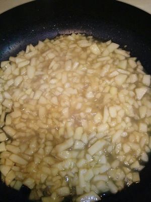 锅烧热后放入10克黄油,融化了倒入苹果丁和白糖,炒出一点点水分后,取两勺玉米淀粉加水稀释,倒进去,小中火熬到自己喜欢的软硬程度,然后出锅晾凉。