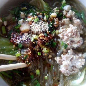 煮好之后把红薯粉装在碗里 把准备好的葱蒜末还有辣椒面放在上面