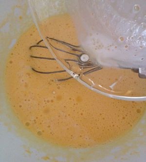 用手动打蛋器搅打搅匀(不必打发),加人玉米油和牛奶搅拌呈均匀的液体状。