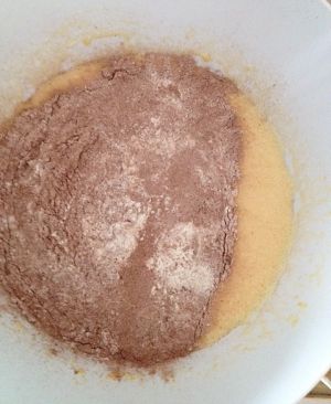 低粉、可可粉、泡打粉过筛后,加入到做法2中,搅拌呈均匀的面糊。