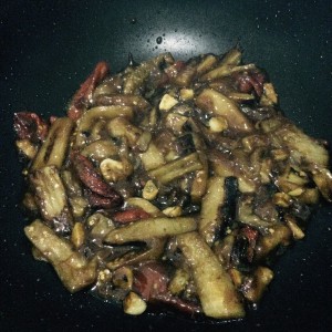锅里再放少许油即可,炒入大蒜生姜,出香味时放入豆瓣酱炒热后倒入茄子和辣椒,翻炒后放入刚才调好的汁,待水收干即可出锅。