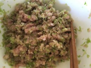 焯好的芹菜切碎成丁,控一下水,放入肉馅中。加入盐、料酒、胡椒粉、蚝油、糖、鸡汁、五香粉等调味,然后顺一个方向搅拌均匀。
