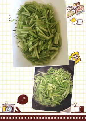 芹菜洗净、去叶,切成段。做开水,芹菜下锅焯3min,焯的时候可以在锅里稍微加点盐,保持芹菜颜色鲜嫩。