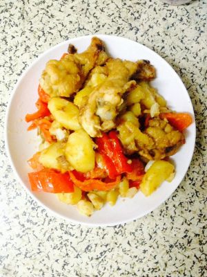 炒至大概10分钟 土豆快熟的时候 倒入鸡腿翻炒