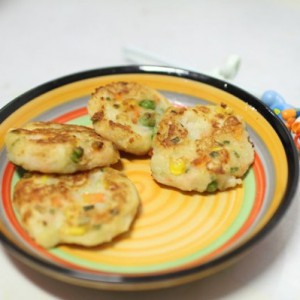 搅拌后捏成饼,油里煎至金黄色,火不要太大,耐心