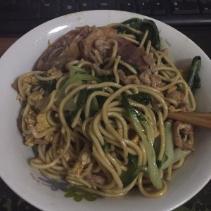 青菜炒熟以后可以倒入面条翻炒,等一分钟后,倒入肉丝和鸡蛋…可以倒一点酱油入味,如果太淡,适量加盐,视情况而定!
