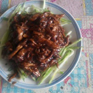 锅放油放甜面酱、糖半碗料酒开始炒酱,待酱粘稠是放肉炒几下,出锅。放在葱上。
