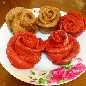 35度温水将酵母化开,盆中筛入面粉,红曲粉,糖分,搅拌均匀,倒入用酵母水,揉成面团