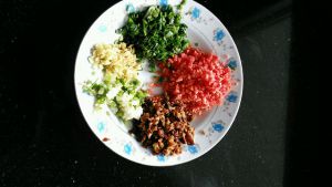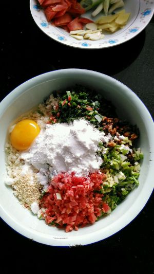 胡萝卜半根另半备用,香菇用水发胀,蒜苗叶,老姜小葱以上几种菜分别切成碎粒。