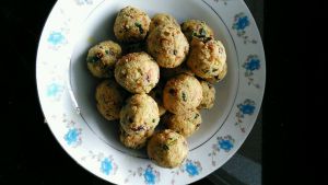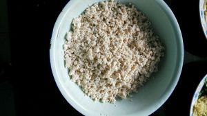 把切好的碎粒到在碎豆腐一起,加鸡蛋盐鸡精,生粉,将其拌均做成丸子。