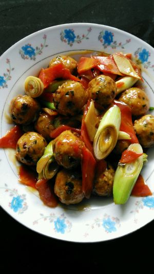 丸子炸好后锅内留少许油,下姜蒜片、大葱炒香下胡萝卜片加水、放生抽少许、鸡精,到入丸子用水豆粉收汁起锅、装盘。