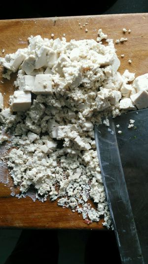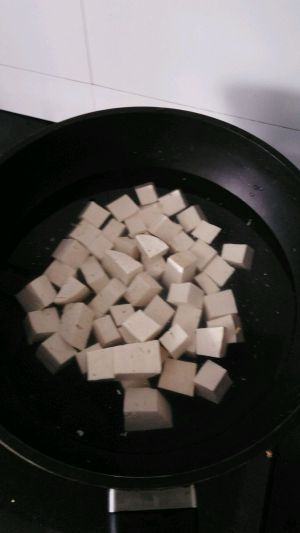 豆腐切成小块,锅内加水放盐把豆腐煮10分钟,然后沥干。