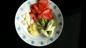 大蒜,姜,胡萝卜切片,大葱切成段。