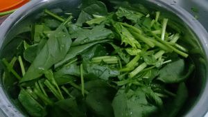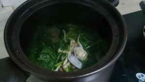 水开后放入一点点油,先放入蚬子和蟹味菇,这两样煮熟放入菠菜,最后放一点盐,就可以出锅了