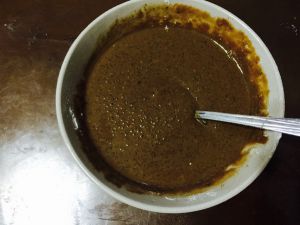 将红糖、芝麻酱、色拉油调和均匀,成浓稠的甜芝麻酱;