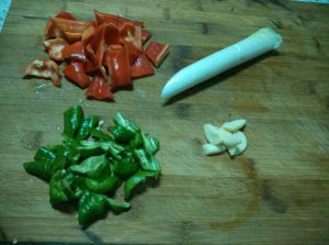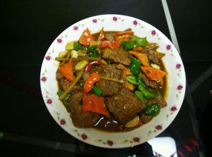 十分钟后淀粉勾芡,放入青椒,红椒翻炒出锅。